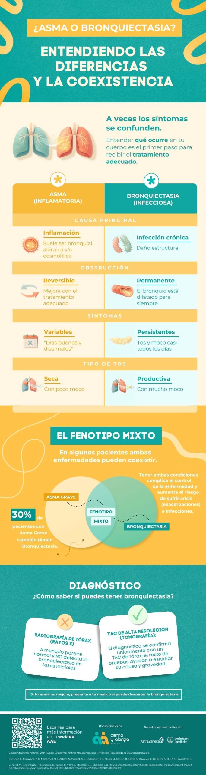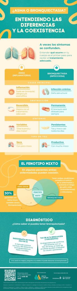 Cuando asma y bronquiectasias están presentes al mismo tiempo (Fenotipo Mixto), los síntomas suelen ser más persistentes y el control de la enfermedad puede ser más complejo.