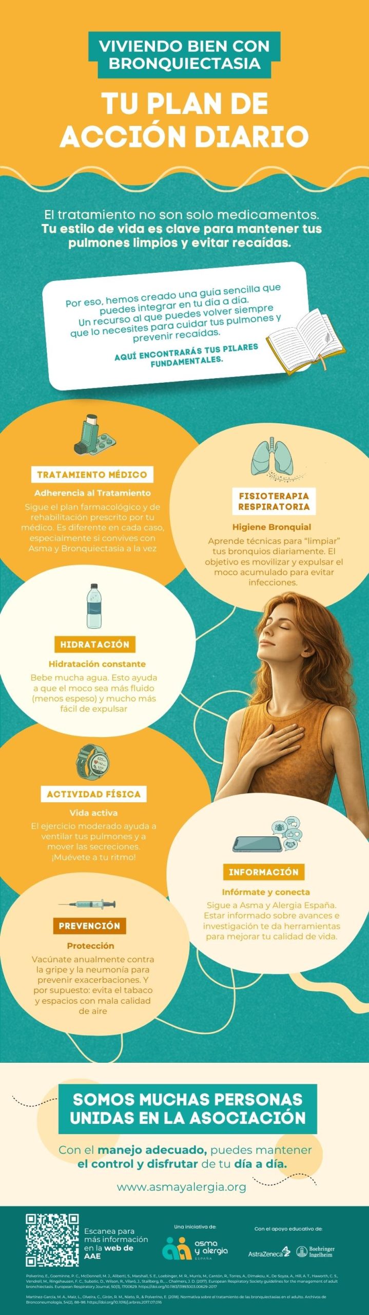 Seguir el tratamiento indicado, aprender y practicar la fisioterapia respiratoria, evitar infecciones y acudir a revisiones periódicas. Tu papel activo es clave para mejorar tu calidad de vida.